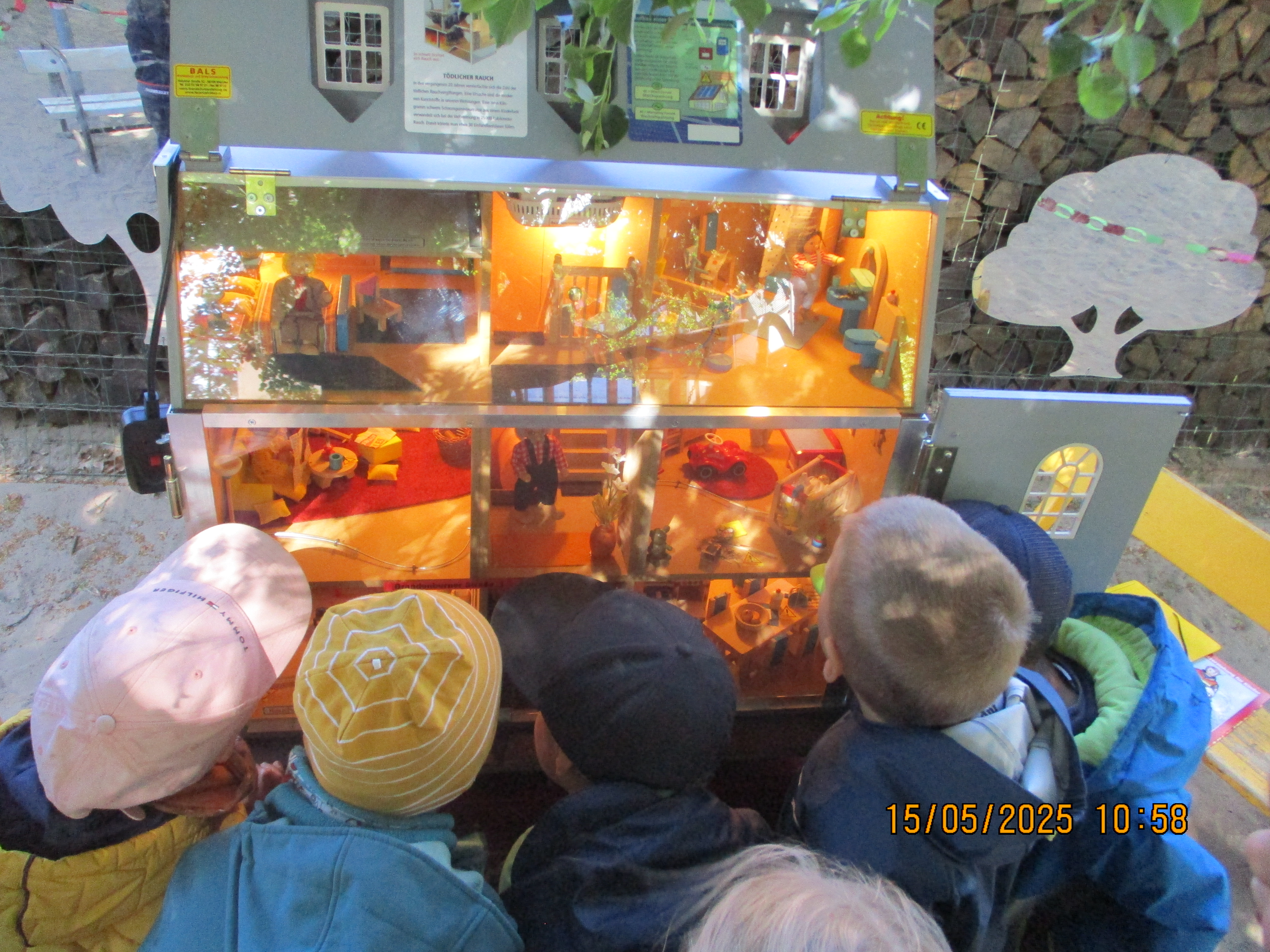 Zum krönenden Abschluss brachte Birgit ein großes Puppenhaus mit Rauchschutzanlage mit. Anhand dieses Modells konnten die Kinder sehen, wie sich Rauch im Haus ausbreitet – der echte Rauch zeigte anschaulich: Rauch steigt immer nach oben! Gemeinsam überlegten die Kinder, wie man sich im Ernstfall richtig verhält: Türen schließen, am Boden bleiben und sich bemerkbar machen. Viele gute Ideen kamen von den Kindern selbst.