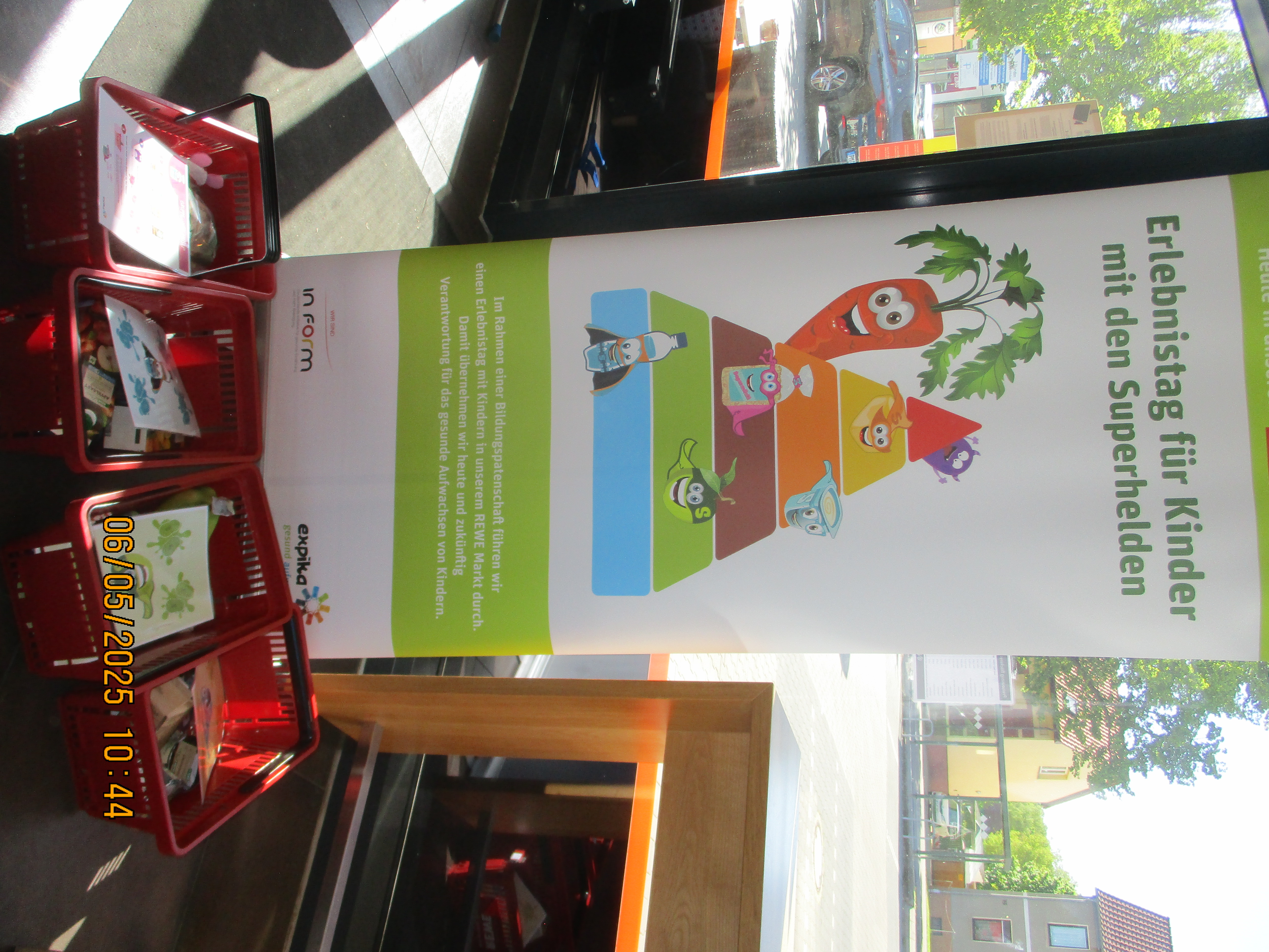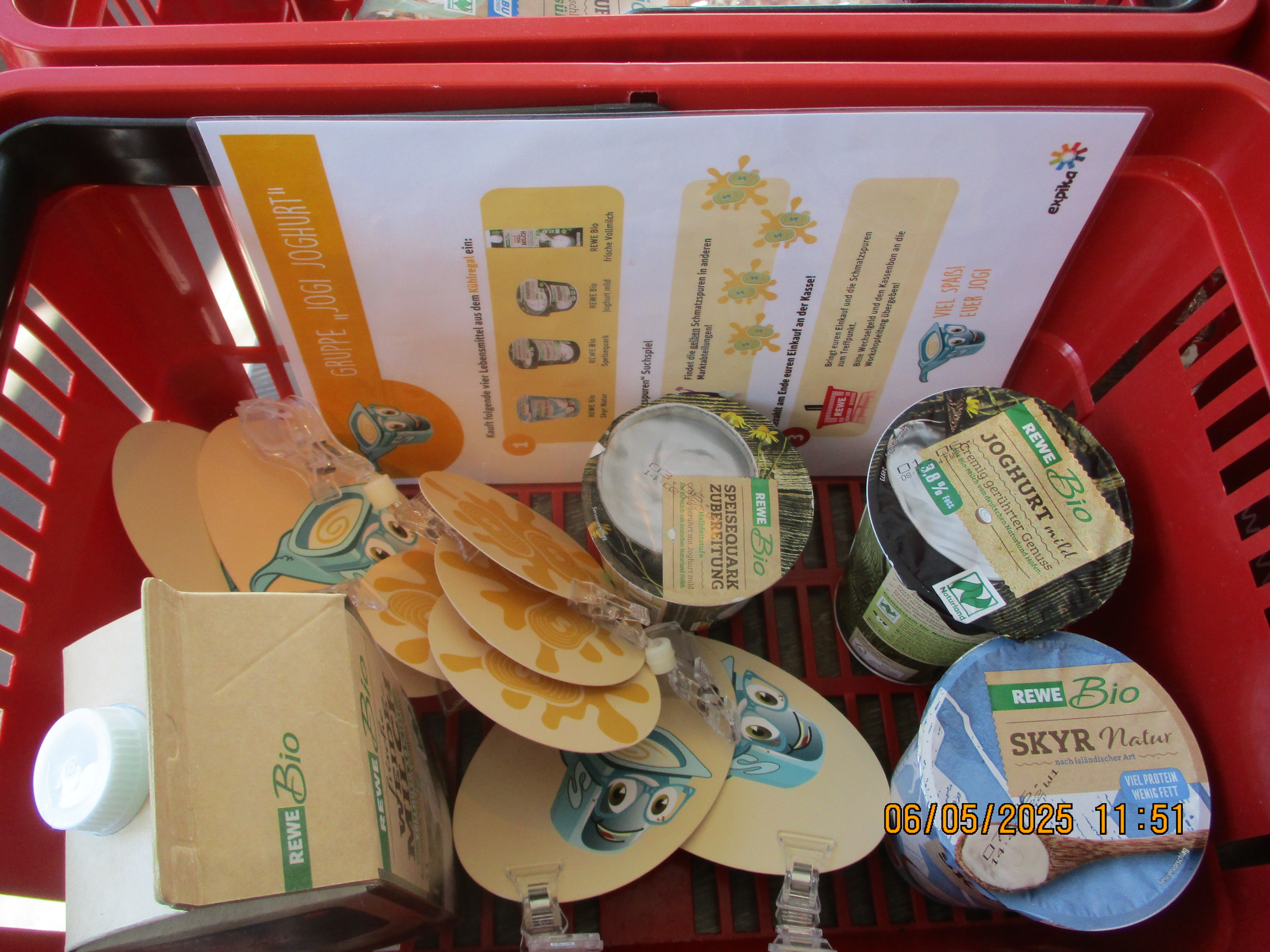 Ein besonderes Highlight wartete anschließend auf die Kinder: Ein Besuch im örtlichen Rewe-Markt. Dort durften sie selbstständig einkaufen und stellten sich die Zutaten für ein gesundes Frühstück zusammen: Milch, Joghurt, Müsli und frisches Obst wanderten in die kleinen Einkaufskörbe. Einige Kinder schlüpften sogar in die Rolle der Kassiererinnen und Kassierer und durften mit echtem Geld arbeiten – ein aufregendes Erlebnis, das für große Begeisterung sorgte.