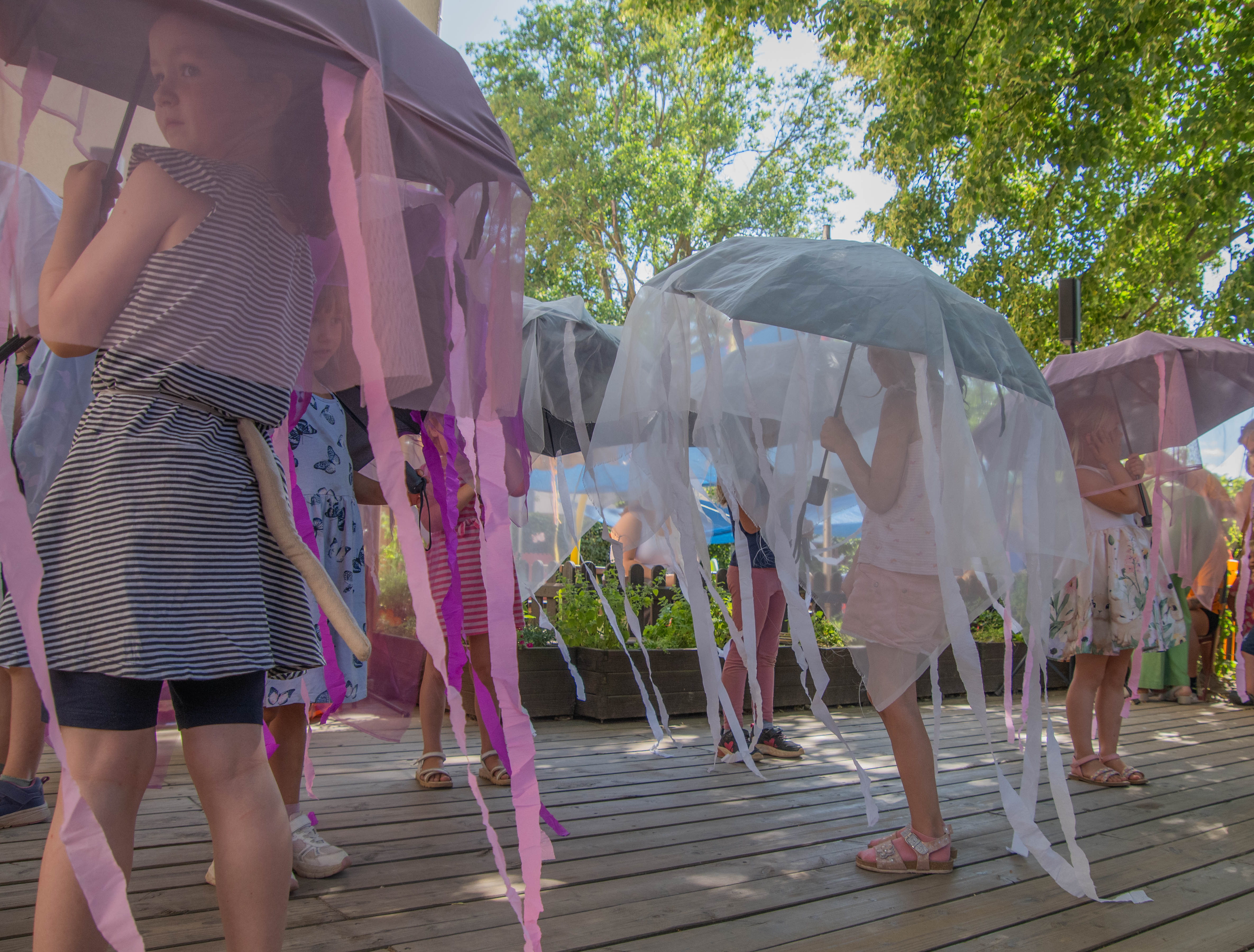 Der Wettergott war auf unserer Seite und bescherte uns Sonne und für alle sehr angenehme Temperaturen. Unsere Musik – Anke (Anke Brocke) machte mit den Kindern und einem ganz wunderbaren musikalischen Programm den Anfang, wie immer sehr ideenreich, fröhlich und voller Begeisterung. Hier drehte sich alles um das Wasser: da gab es Enten, die immer wieder vor dem Fuchs flüchten mussten; Quallen und Meerjungfrauen zeigten ganz bezaubernde Tänze, die Krebse rockten zur Musik mit ihren Scherenhänden – dies alles eingebettet in einer Geschichte. Alle Eltern und Gäste waren voller Bewunderung, mit welcher Selbstverständlichkeit und welchen Mut sich selbst die jüngeren Kinder auf die Bühne trauen.