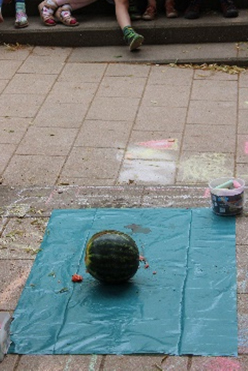 Großen Eindruck hinterließ auch das "Wassermelonen-Experiment": Eine Melone, einmal geschützt durch einen Helm und einmal ungeschützt, wurde zu Boden fallen gelassen. Das Ergebnis war eindeutig – ein eindrucksvolles Bild dafür, wie wichtig ein Helm sein kann. Zum Schluss war allen Kindern sonnenklar, welche der beiden Melonen im Helm gewesen war – eine spannende und lehrreiche Demonstration.